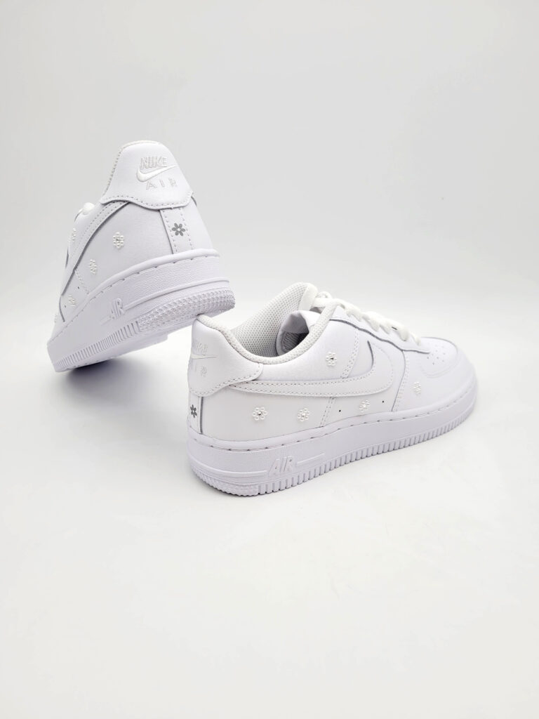 Nike Air Force 1s are popular sneakers among sneaker fans. Customization allows you to wear a unique pair of Nike Air Force 1s every day. With their numerous textures, these sneakers offer the possibility of enhancing the shoes with just a few personalization elements. Inscriptions, patterns, and color can embellish the sides and the back of the upper. The most distinctive feature of personalized Nike Air Force 1 sneakers is, without a doubt, the famous Swoosh. The Nike logo can be completely customized with the color of your choice or with small, sparkling rhinestones. We can say that the personalized Swoosh will be the central element of your creation.