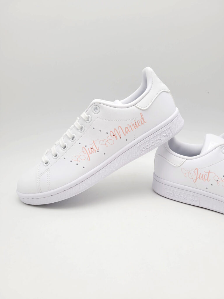 Adidas Stan Smith sono le scarpe da ginnastica perfette da personalizzare in base al tema del tuo matrimonio, al tuo outfit del grande giorno o semplicemente secondo la tua personalità. È facile migliorare tutte le parti del basket con molti elementi di personalizzazione. Da amanti dell'amore, dei motivi, delle iscrizioni, dei strass, dei lacci di raso o di tulle, adidas può diventare vere scarpe da sposa! La grande peculiarità delle sneaker personalizzate di Adidas Stans Smith per un matrimonio è la personalizzazione della patch sul retro delle scarpe usando il colore di tua scelta. Qualcosa per aggiungere un bel tocco di colore al tuo abito da sposa!